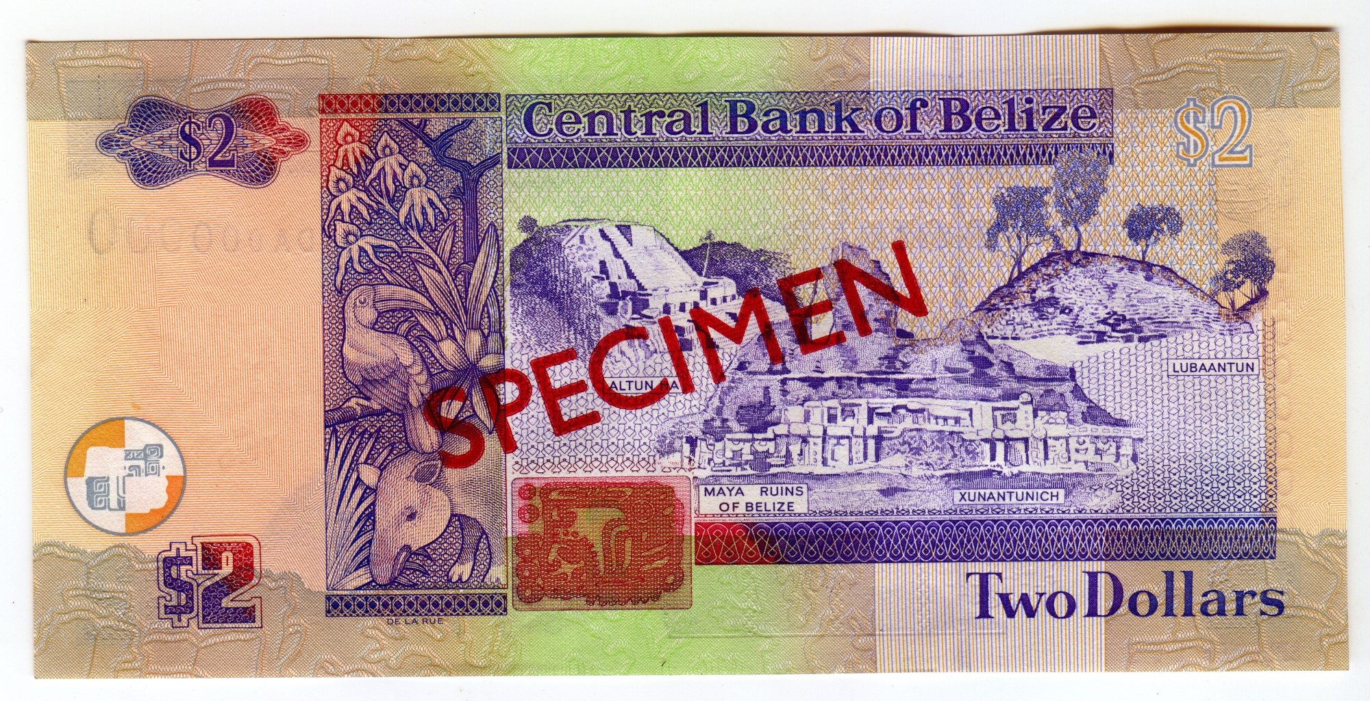The main picture on the reverse of the note shows three historical buildings of Belize City, as they appeared around 1910. The Court House in the centre of the design was partially destroyed by fire in 1918 and the Clock Tower had to be replaced. On the right is St John’s Cathedral, the first Protestant Episcopal Church founded in Spanish America. On the left is Government House, which was the residence of governors during the Colonial period.